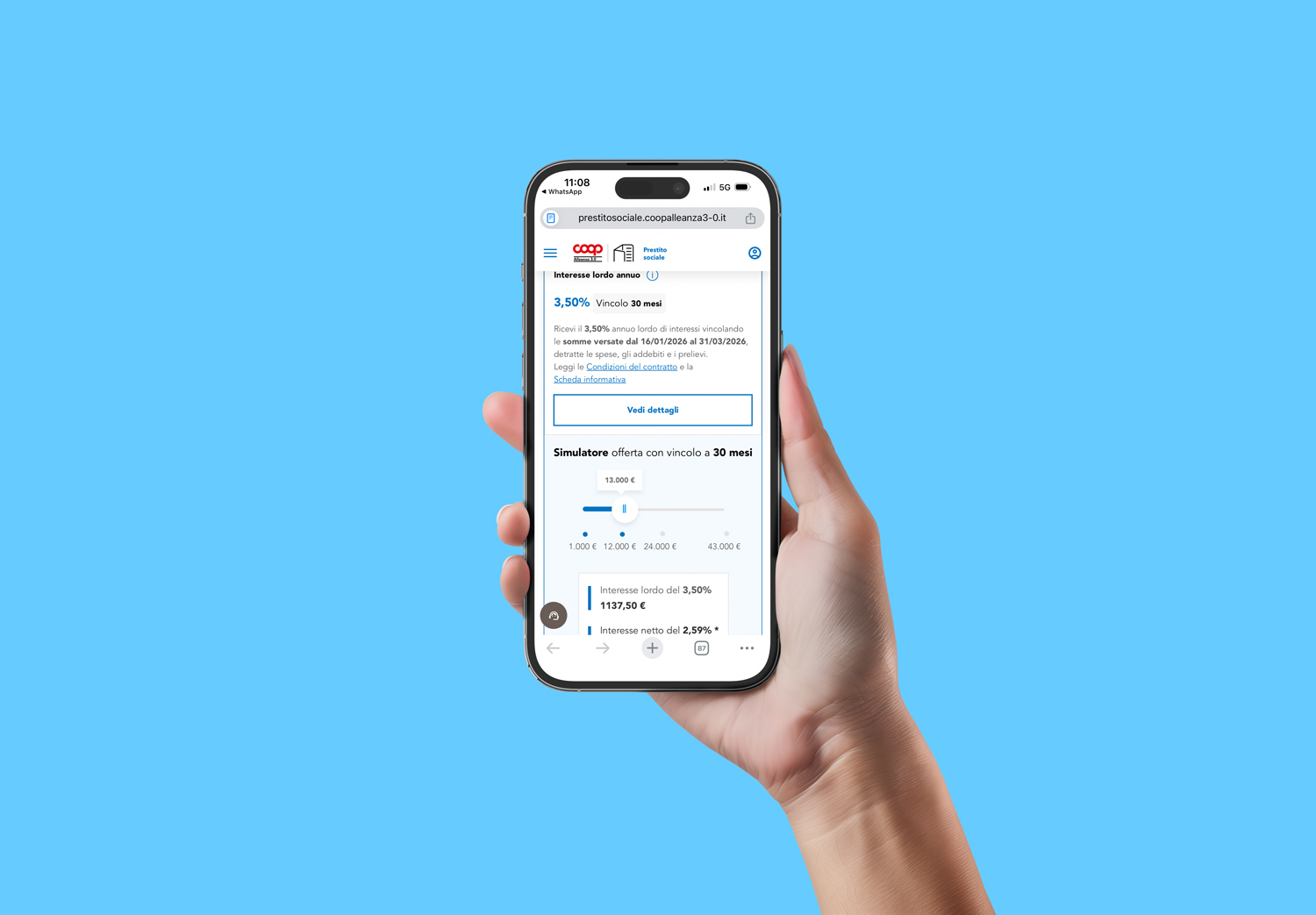 Puoi vincolare tutto il denaro che hai sul libretto o solo una parte. La cifra minima è 1.000,00€ (ad eccezione del Piano 18 mesi di benvenuto, importo min 5.000,00€) e puoi vincolare solo multipli di 1.000,00€. Alla scadenza del Piano scelto, gli interessi saranno accreditati direttamente sul tuo libretto, al netto della ritenuta fiscale di legge vigente alla data di estinzione.